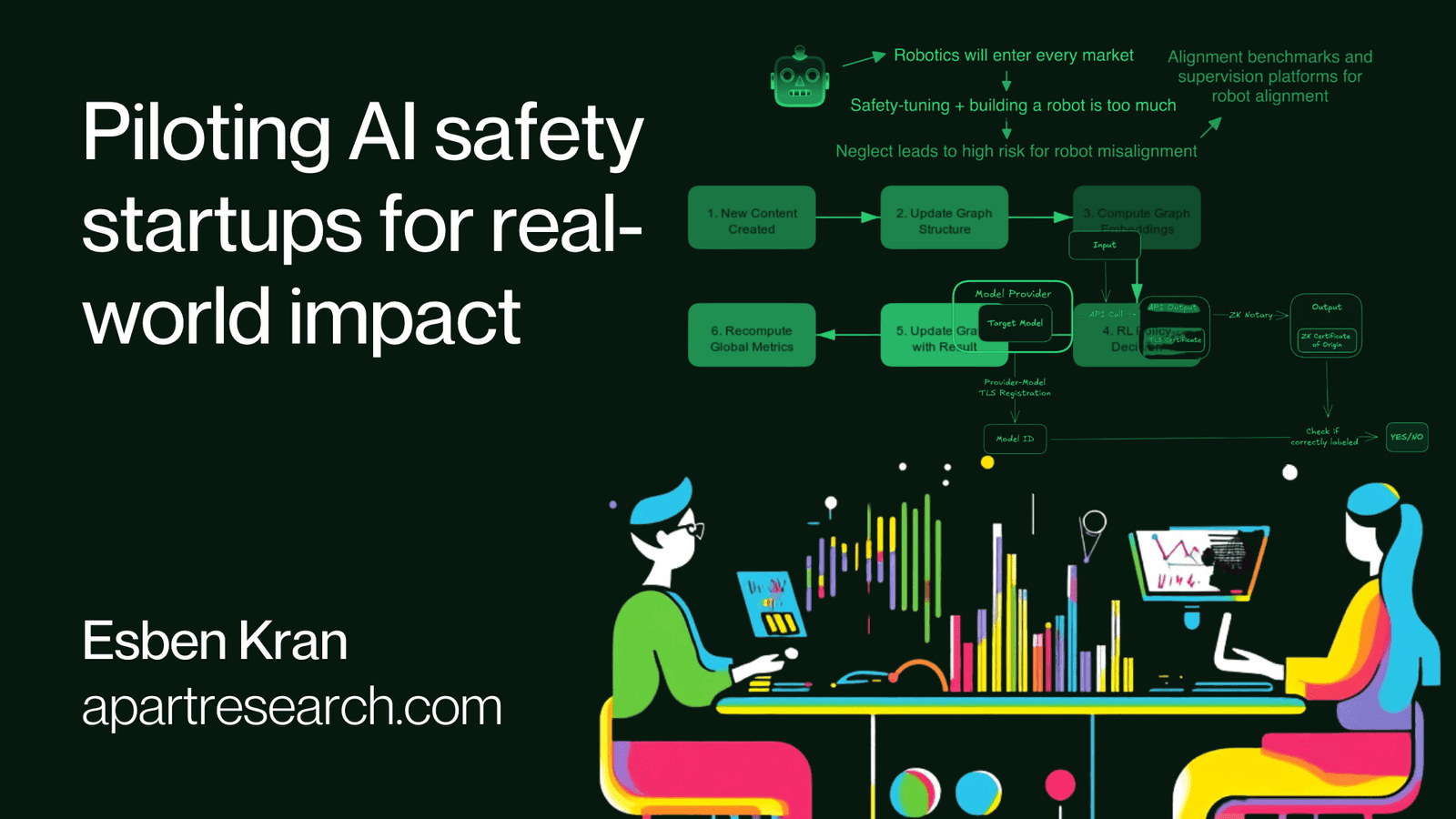 To understand impactful technical AI safety startups better, Apart Research joined forces with collaborators from Juniper Ventures, vectorview (alumni from the latest YC cohort), Rudolf (from the upcoming def/acc cohort), Tangentic AI, and others. We then invited researchers, engineers, and students to resolve a key question “can we come up with ideas that scale AI safety into impactful for-profits?”