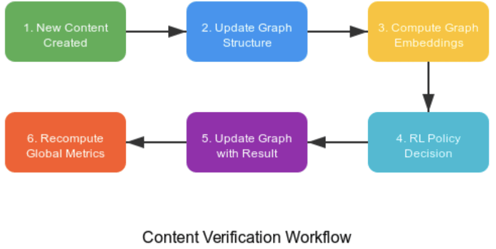 Content verification workflow supported by graph-based RL agents deciding verifications