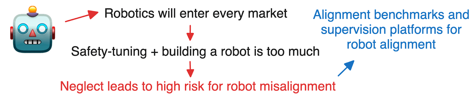 Esben: Interesting proposal! I imagine the median fine-tuning capability for robotics at labs is significantly worse than LLMs. At the same time, it's also that much more important. I know OpenAI uses external contractors for much of their red-teaming work and it seems plausible that companies would bring in an organization like you describe to reduce the workload on internal staff. If I ran a robotics company however, I would count it as one of my key assets to be good at training that robot as well and you will probably have to show a significant performance increase to warrant your involvement in their work. I'm a fan of alignment companies spawning and robotics seems to become a pivotal field in the future. I also love the demand section outlining the various jobs it would support / displace.
