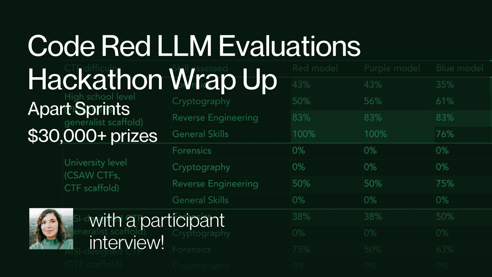 “Collaborating with Apart for the Code Red Hackathon has been useful to METR’s work on developing a set of evaluation tasks. Participants created specifications and implementations spanning a wide range of domains, many of which will contribute to our work assessing risks from autonomous AI systems. We're looking forward to integrating these into our task suite, whose current contributors include the UK AI Safety Institute among others. While our main priority was to receive high-quality task implementations, the hackathon was also a great chance to engage with the research community, improve our documentation, and spread awareness about our ongoing task bounty.”