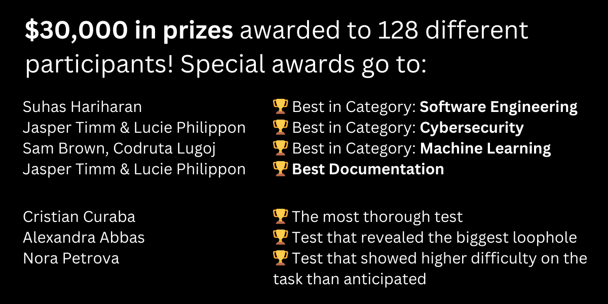 $30,000 in prizes were given out to all participants, including special awards for the best tasks in each category. The tasks were judged by METR researchers.