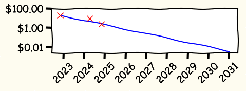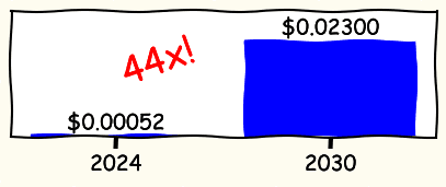 Historically, the price for frontier models have been $20 / 1M tokens (Nov 2022) to $60 ($10) / 1M input tokens (Apr 2024) to today’s $2.50 / 1M input tokens. Doing a (very rough) extrapolation to 2030 of these points, we may expect an $0.01 / 1M token price for frontier intelligence.