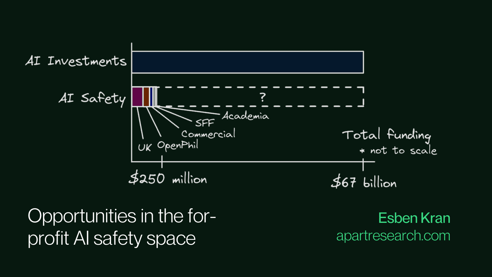AI development attracts more than $67 billion in yearly investments, contrasting sharply with the $250 million allocated to AI safety. This gap suggests there's a large opportunity for AI safety to tap into the commercial market. The big question is how do you close that gap?