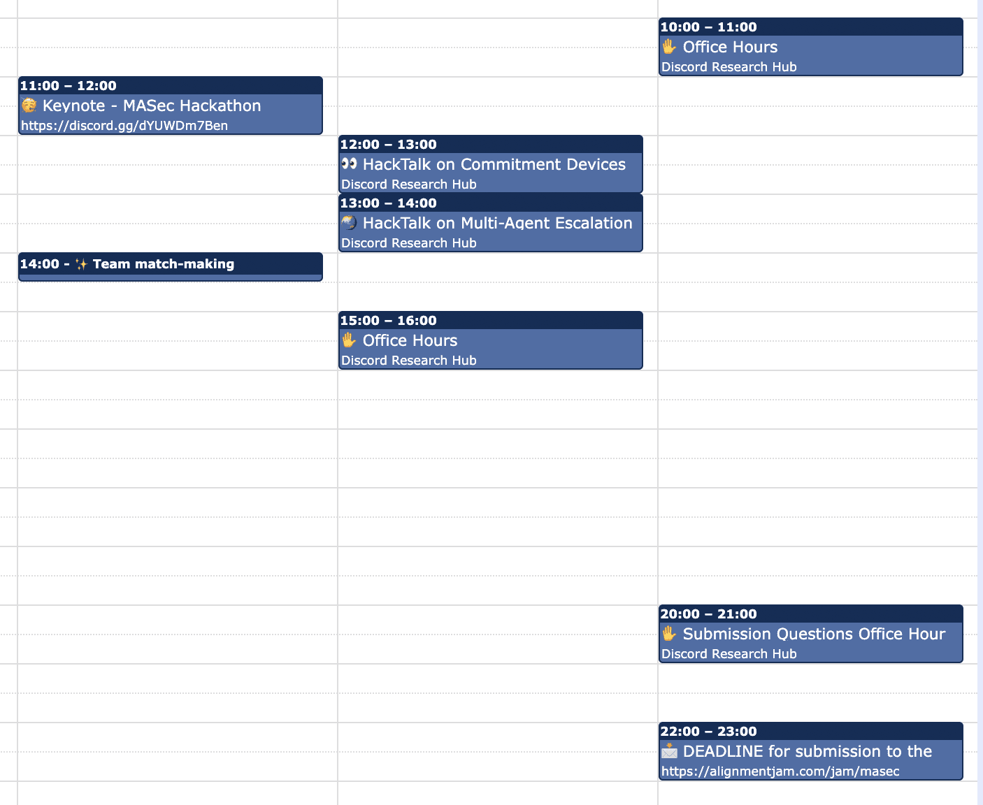 Hackathon schedule: The research sprints usually last from Friday to Sunday all over the world, meaning we start late Friday UTC and end early Monday morning UTC. Please subscribe to the calendar here to stay up-to-date on the next events. In general, it kicks off with a keynote from an established researchers in addition to logistical information and a team match-making session, then a few Q&A sessions over the weekend plus a couple of technical talks during Saturday, and end with the submission deadline for Sunday evening. See an example for the Multi-Agent Security Hackathon from February 2024 under the "Schedule" tab here.