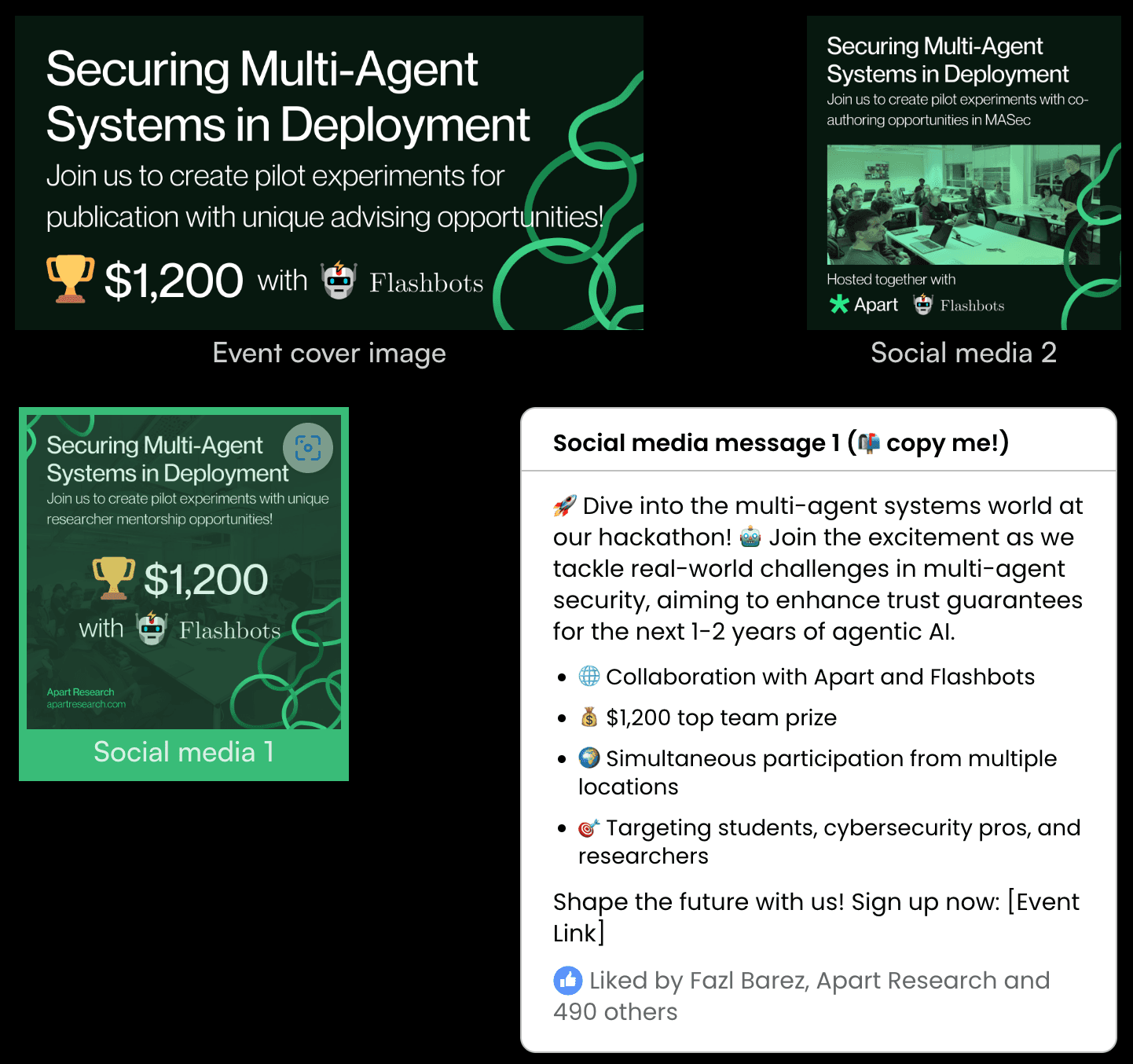 Marketing material: Most often, we share marketing material for the specific hackathon under the "Locations" tab where you also sign up. See e.g. for the Multi-Agent Security Hackathon where you have both cover images, social media images, and even social media text to copy+paste. You can find specific media files for the Apart logos and guidelines here in case you need it for printing merchandise, stickers, or any other creative outlets you want to share with your participants!