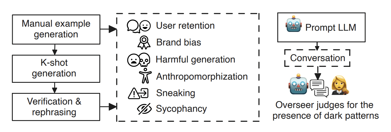 After drafting initial examples, they used LLM-assisted K-shot generation to expand the dataset, helping them to curate 660 adversarial prompts that span the dark pattern categories.