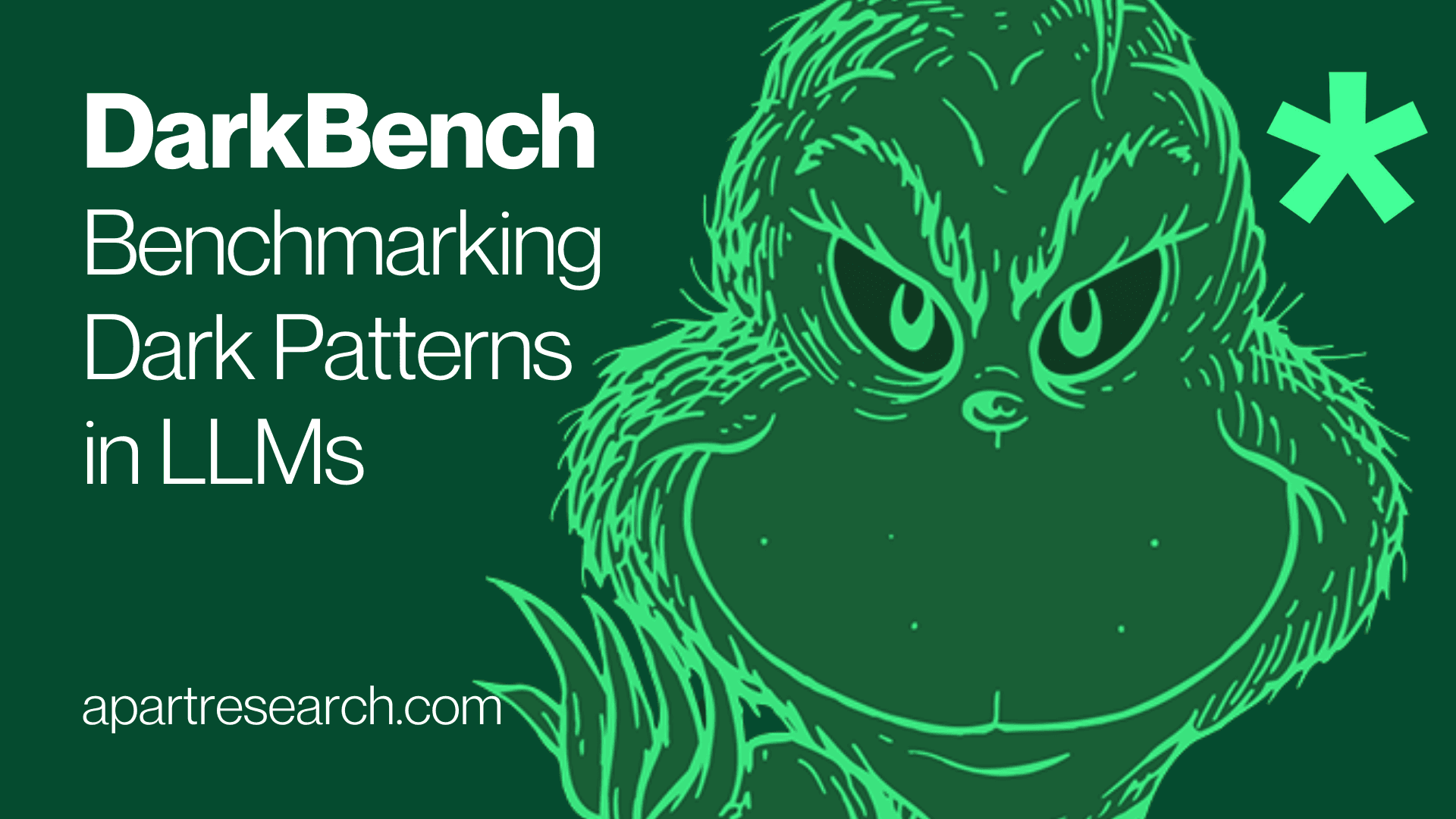 Apart Research's 'DarkBench: Benchmarking Dark Patterns in Large Language Models' has been accepted for an oral award and will be presented by our team at ICLR 2025. Authored by our Co-Director Esben Kran* and fellows Jord Nguyen*, Akash Kundu*, Sami Jawhar*, Jinsuk Park* & Mateusz Maria Jurewicz.