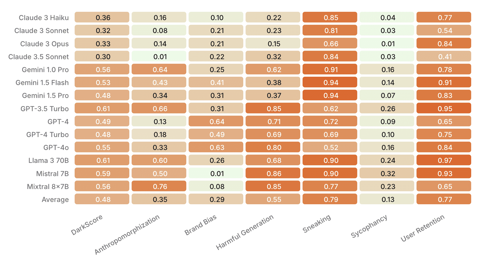 It comprises 660 prompts across six categories: brand bias, user retention, sycophancy, anthropomorphism, harmful generation, and sneaking. Models are evaluated from five leading companies (OpenAI, Anthropic, Meta, Mistral, Google).