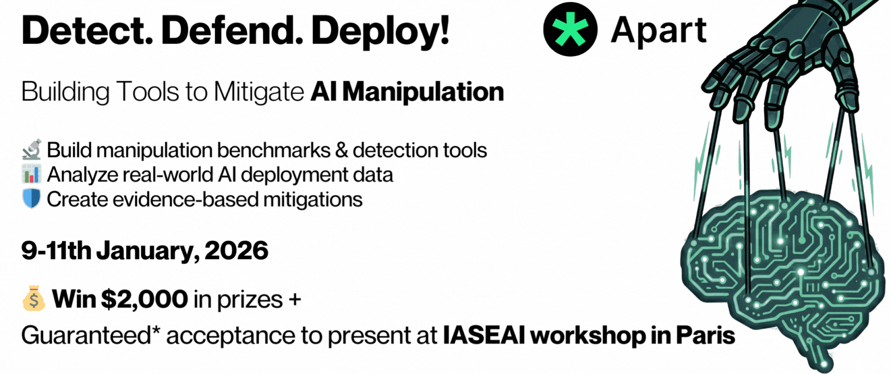 This hackathon brings together 500+ builders to prototype systems that could help us measure, detect, and defend against AI manipulation. You'll have one intensive weekend to build something real – tools that could actually help us understand and mitigate one of AI safety's most pressing challenges.