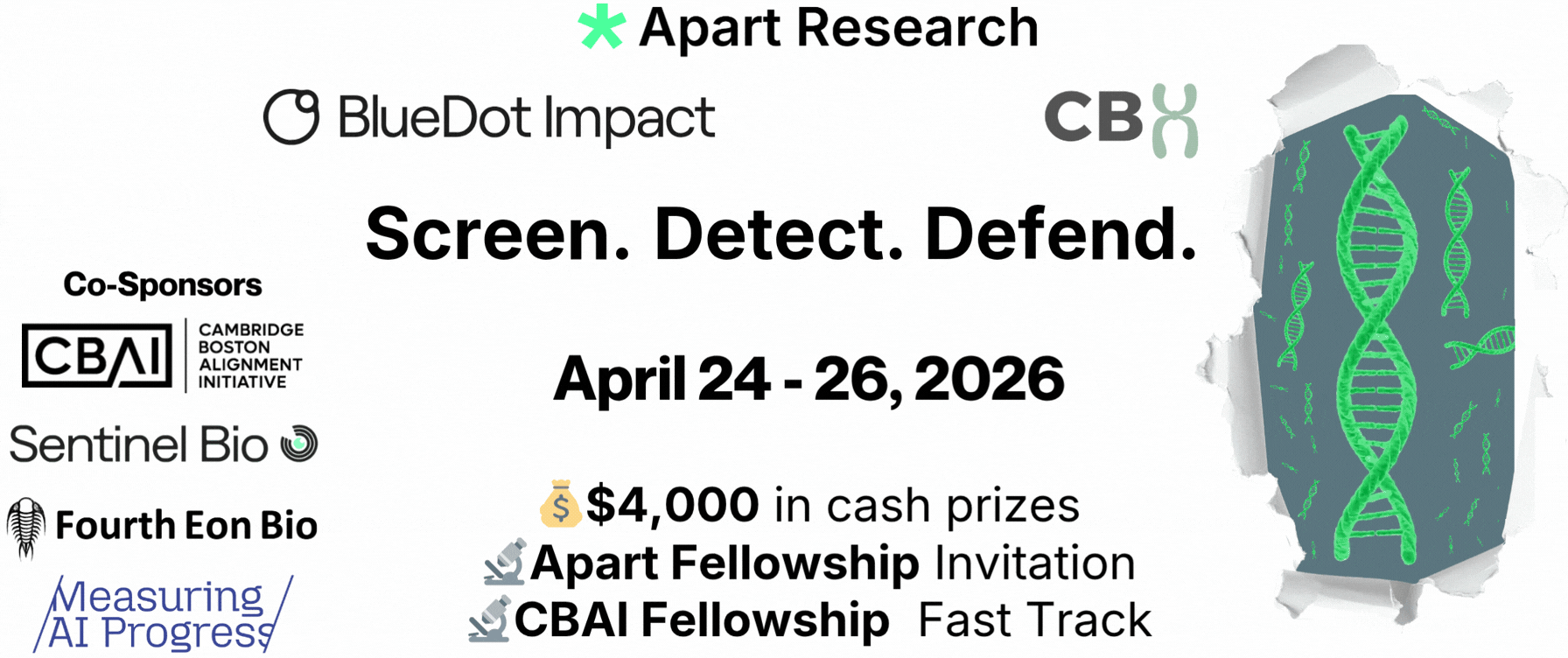 Apart Research has organized 55+ research sprints with 7,000+ participants across 200+ global locations. Co-organized with BlueDot Impact and Cambridge Biosecurity Hub, with track sponsorship from CBAI, Sentinel Bio, Fourth Eon Bio, and Measuring AI Progress. Our hackathons produce real research output: published papers, new research collaborations, and contributions to open-source safety tools used across the field.