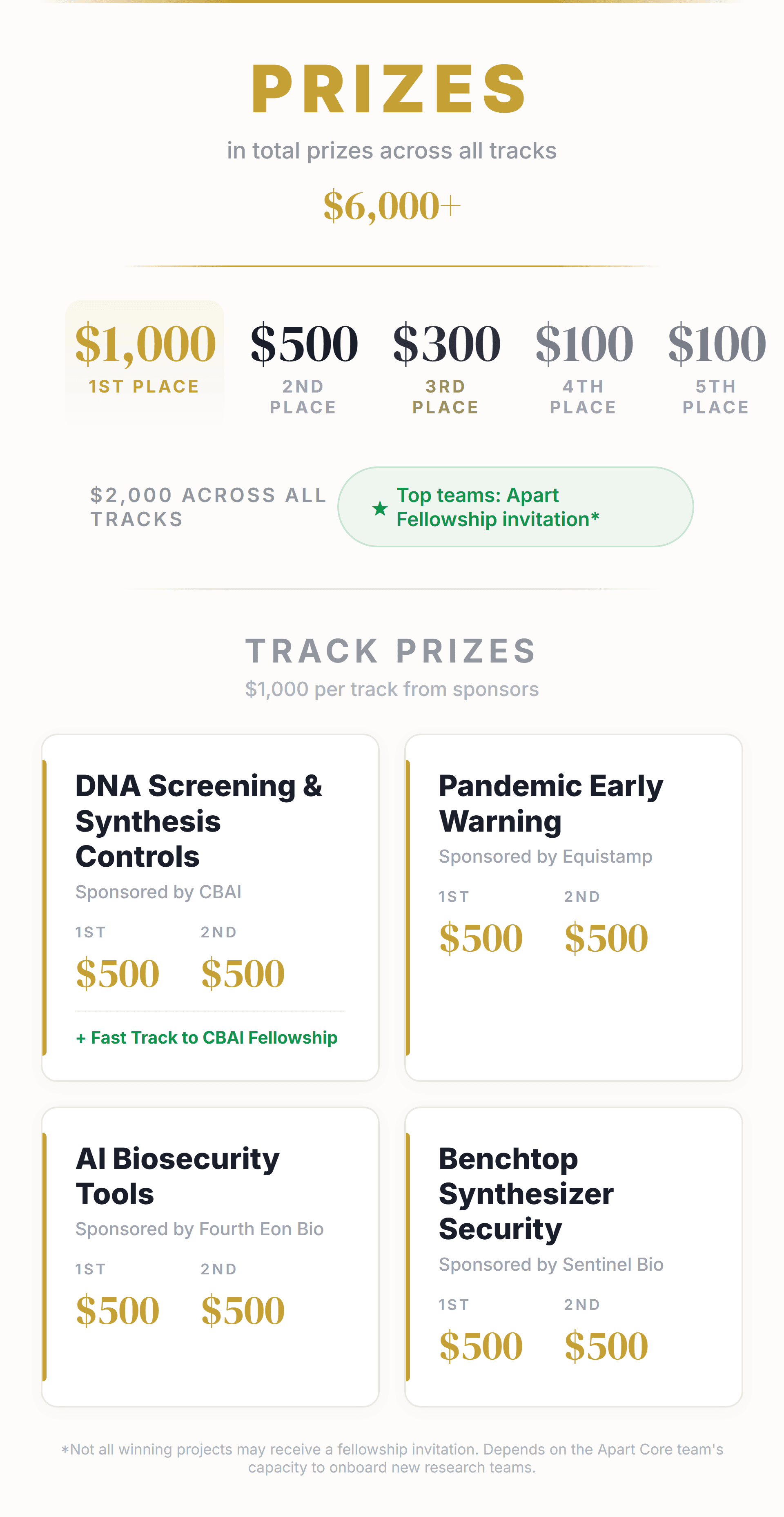 Track sponsors: CBAI (DNA Screening & Synthesis Controls) | Measuring AI Progress (Pandemic Early warning) | Fourth Eon Bio (AI Biosecurity Tools) | Sentinel Bio (Benchtop Synthesizer Security)
