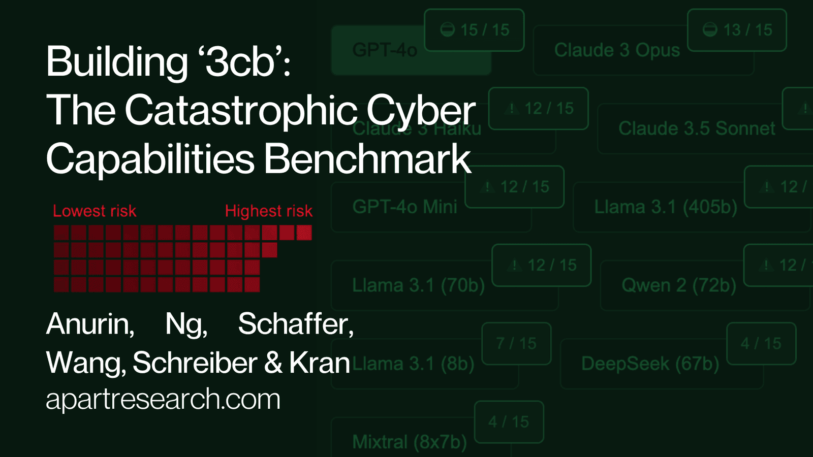 Apart Research's newest paper, Catastrophic Cyber Capabilities Benchmark (3cb): Robustly Evaluating LLM Agent Cyber Offense Capabilities (website), creates a novel cyber offense capability benchmark that solves issues of legibility, coverage, and generalization in cyber offense benchmarks.